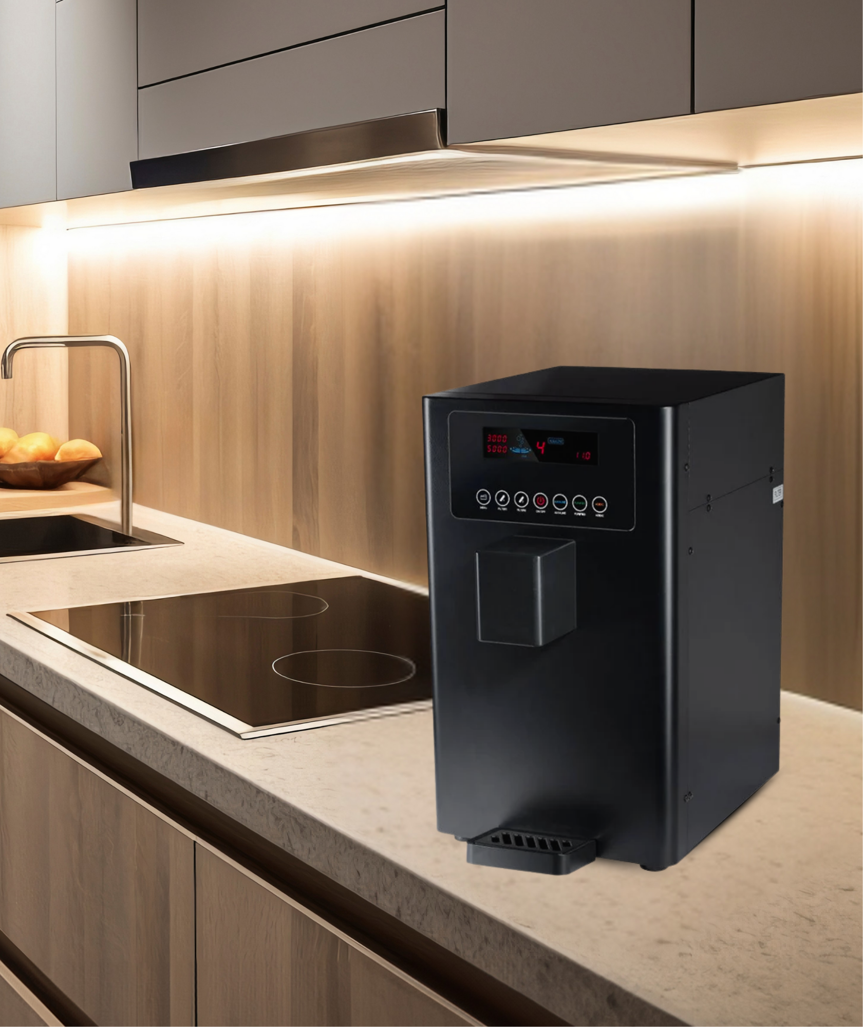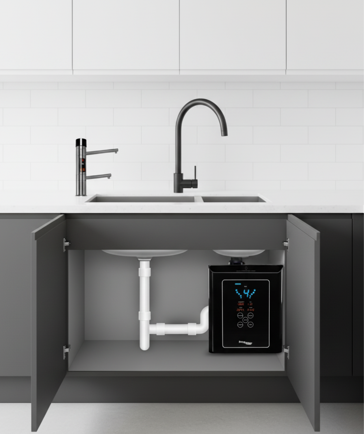 A discreet ionizer hidden under the counter, delivering clean alkaline water through a stylish dedicated tap.